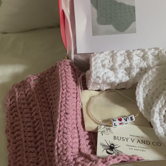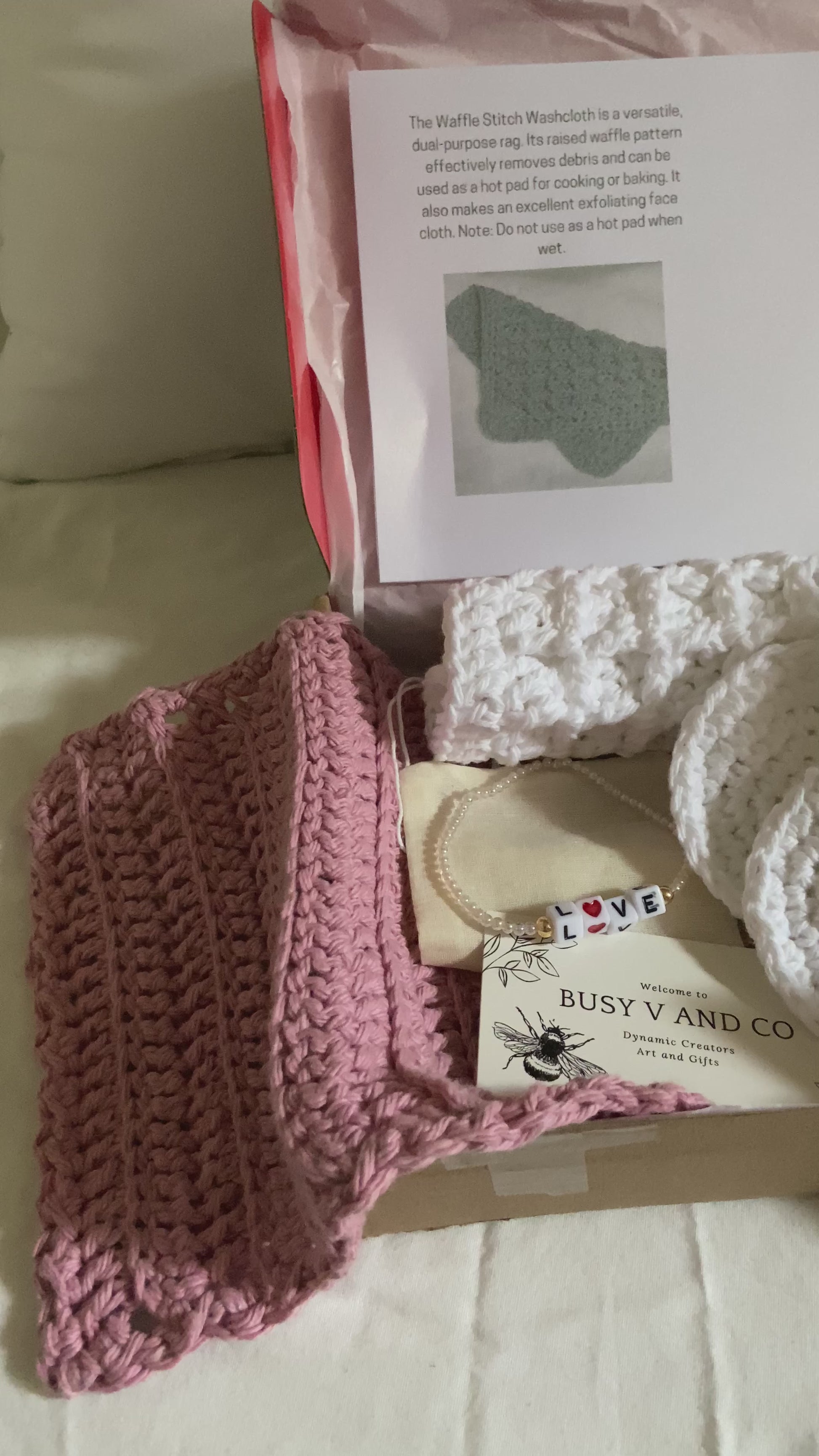 Enjoy the luxury of an all-inclusive crochet spa set, featuring a handmade encouraging bracelet, 100% cotton washcloths, face pads, and loofah, all made with durable fiber and high-quality craftsmanship. You deserve to rest and reset with handmade products that fit your needs and make your bathroom beautiful. These products are made to last and function well, so you can replace your disposable bathroom supplies with zero-waste alternatives. Get everything you need in our bundles and pay less for great products!