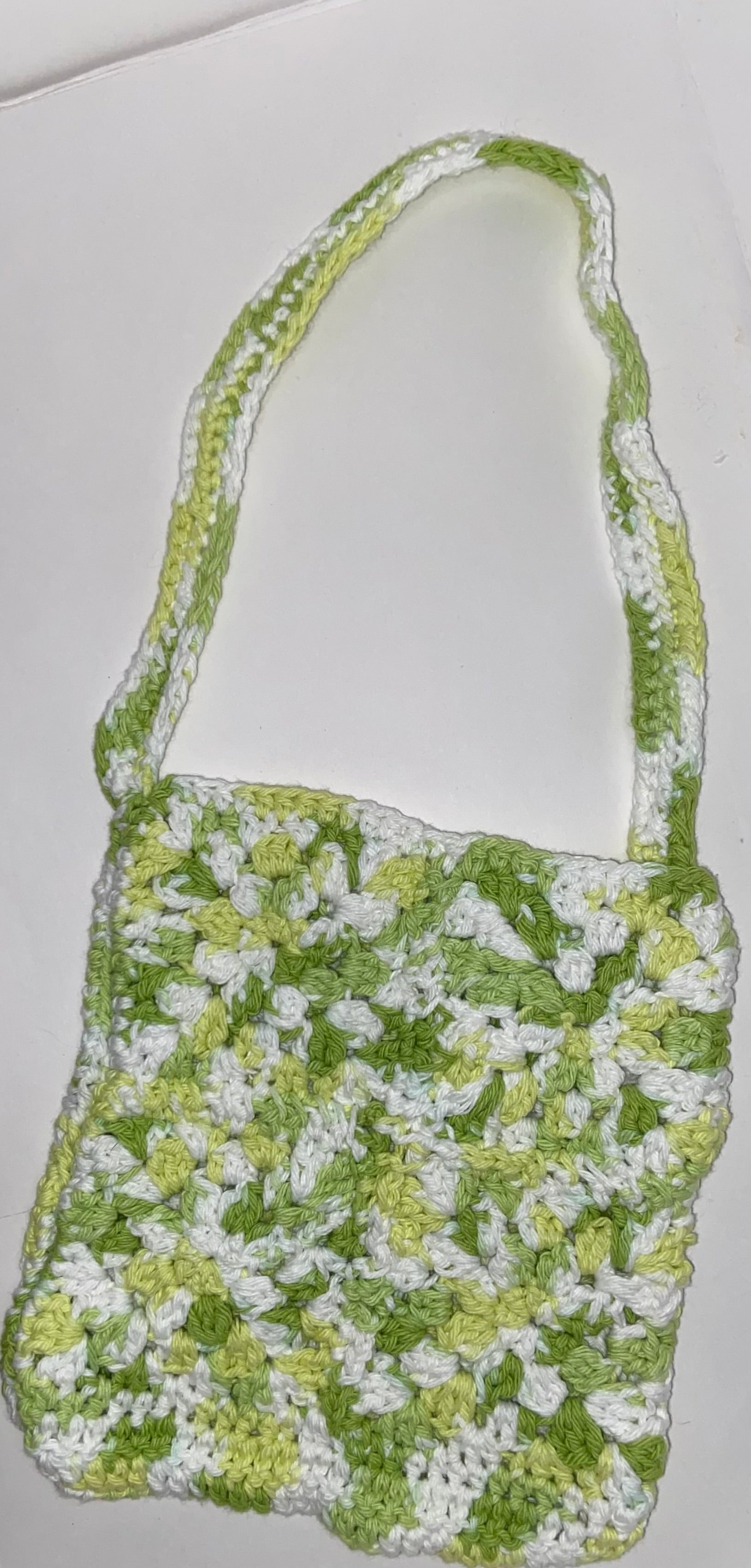 Multicolor beauty, this bag is made to carry a few items when you’re out. Greens and white cotton yarn make up this bag, creating a cute cottage-core tote bag for you! Hold your phone and wallet while looking unique and adorable!
