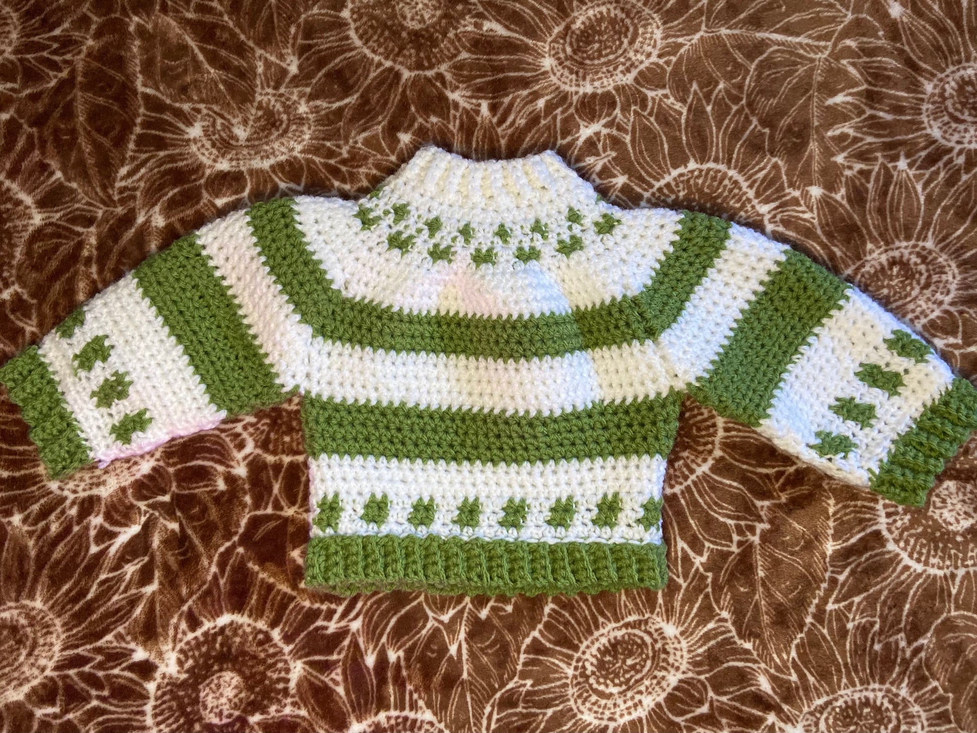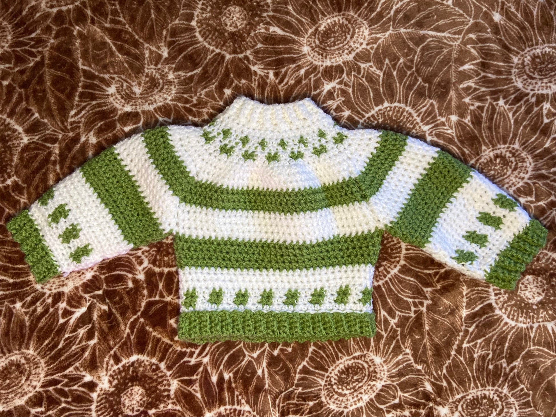 Add a cute styled green and white sweater to your baby's wardrobe! Made with acrylic yarn and sized about a 3-month-old, this adorable sweater will impress. Slightly chunky and made with love, I know you'll enjoy this piece.